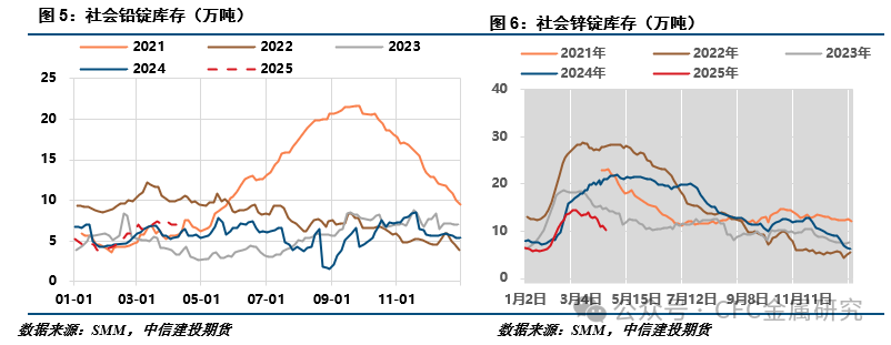 正文 行情回顾 周内锌价先扬后抑。截止到本周四,0#锌锭现货周均价 22658元/吨,整体较上周平均跌幅0.61%。美国关税战的贸易紧张局面虽有短暂缓和,但经济前景仍不容乐观,美国消费者信心连续5个月下降,经济负面效应持续显现,投资者担忧美国正面临“低增长、高通胀”风险,避险情绪走强下,周内锌价承压偏弱。 周内沪铅低位震荡。宏观面,关税风险短时缓和,美联储官员讲话立场表明对短期下调利率的态度并不乐观。因担心通胀卷土重来,仍需更多的数据来作判断。美元指数三连阴之后重回100整数关口下方,伦铅振幅1950-2000美元/吨。但周内海外铅库存突增3万余吨,伦铅承压下行接近区间下限。此前铅价回升使国内再生铅炼厂亏损略有修复,部分企业低负荷复产,湖南、贵州新建产能投产,同时粗铅进口到货环节再生原料紧张预期,废电瓶价格大幅降低,成本支撑松动。消费端,蓄企仍以长单接货为主,消费整体表现不佳。供需平衡边际转弱铅价震荡下行,关注16700一线支撑。 价格影响因素分析 1、国际宏观 特朗普威胁自6月1日起对欧盟征收50%关税。日本首相石破茂:与特朗普进行了通话,日本将继续寻求取消额外的美国关税。报道:印度和美国可能在未来7-10天内达成原则性贸易协议。美国海关日关税收入增至创纪录的165亿美元。 特朗普:我警告过库克,苹果必须本土制造,不然征税25%!分析师:“荒谬”,苹果扛下关税都比迁回美国强。苹果股价八连跌。特朗普对三星和其他手机制造商发出关税威胁。贝森特:关税威胁是促欧盟提速,未来数周将出现几个大的贸易协议,SLR将修改、有望支撑美债,预计到2028年美国预算赤字占GDP的比重降至“以3%开头”,部分依赖关税收入。 美国5月Markit制造业和服务业PMI均超预期且扩张,价格指数再涨。欧元区5月PMI意外萎缩,服务业创16个月来最差表现。 一票之差,特朗普减税案在众院涉险过关,参院还有难关得过。美联储当红理事沃勒:减税法案引发美债抛售,若关税企稳下半年将降息。美国暂停哈佛大学招收国际学生资格,在校外国学生转学“否则将失去合法身份”。 2、国内宏观 中国5年期和1年期LPR利率均下调10基点,为年内首降。5月20日周二,中国人民银行授权全国银行间同业拆借中心公布,中国1年期贷款市场报价利率(LPR)最新报3.00%,上次为3.10%;5年期LPR报3.50%,上次为3.60%。 中国商务部:美方行为严重破坏中美日内瓦高层会谈共识,要求美方纠偏纠错。商务部表示,中方注意到,近日美方对AI芯片出口管制指南新闻稿相关表述进行了调整,但指南本身的歧视性措施和扭曲市场本质并没有改变。中方敦促美方立即纠正错误做法,停止对华歧视性措施。若美方一意孤行,继续实质性损害中方利益,中方必将采取坚决措施,维护自身正当权益。 4月社会消费品零售总额同比放缓至5.1%,家电家具、文化用品等以旧换新相关商品增长较快。消费品以旧换新政策持续显效,限额以上单位家用电器和音像器材类、文化办公用品类、家具类、通讯器材类商品零售额分别增长38.8%、33.5%、26.9%、19.9%。金银珠宝类零售总额同比增长25.%,汽车类消费增长0.7%,石油及制品类零售额下降5.7%。 4月规模以上工业增加值同比增长6.1%,工业机器人、新能源汽车产量加速增长。41个大类行业中有36个行业增加值保持同比增长,铁路、船舶、航空航天和其他运输设备制造业、电气机械和器材制造业等增速较快。工业机器人、新能源汽车产品产量同比分别增长51.5%和38.9%。 3、精炼锌与再生铅利润亏损不一 精炼锌方面,截止5月22日,本周精炼锌厂冶炼利润收于-484元/吨,亏损较周初走扩。海内外锌矿供应逐步修复,国内加工费持平3500元/吨,进口加工费持平45美元/吨,锌价下跌贡献主要跌幅。 原生铅方面,国产矿TC降至600元/吨,进口矿TC降至-30美元/吨;白银收益环比上升。再生铅方面,废电瓶周内价格回落,再生利润回升,截止5月23日,SMM再生铅冶炼利润持平-1190元/吨。 4、库存情况:到货整体较少,铅锌小幅去库 据SMM沟通了解,截至本周四(5月22日),SMM七地锌锭库存总量为8.04万吨,较5月15日减少0.59万吨,较5月19日减少0.34万吨,国内库存录减。上海地区周内到货较少,同时下游企业存在刚需采购并不断提货带动库存下降明显。广东地区同样到货较少,库存出现小幅下降。天津地区下游采购需求有所放缓叠加周内到货正常,库存小幅增加。整体来看,原三地库存减少0.30万吨,七地库存减少0.34万吨。 据SMM了解,截至5月22日,SMM铅锭五地社会库存总量至5.03万吨,较5月15日减少0.57万吨;较5月19日减少0.88万吨。本周铅价呈震荡下行态势,原生铅炼厂普遍随行出货,报价对SMM1# 铅均价贴水50元/吨到升水100元/吨出厂,而再生铅炼厂因亏损扩大,低价惜售情绪上升,部分企业暂停出货,再生精铅报价贴水收窄至对SMM1#铅均价贴水50-0元/吨出厂,甚至出现升水报价,与原生铅价格形成倒挂,并且主要产区再生铅炼厂再次出现减停产的情况,下游企业刚需采购则是偏向原生铅货源。此外,上周沪铅交割后的货源重新流入市场,部分下游企业优先选择就近采购,江浙津地区社会库存均有明显减量。与此同时,再生铅新建产能与复产推进,供应增量预期上升,但铅蓄电池市场淡季势头不改,预计供应增量兑现后,铅锭社会降势或放缓。 相关图表 观点与策略 锌:宏观面,特朗普威胁6月1日起对欧加征关税,市场避险情绪再度升温
