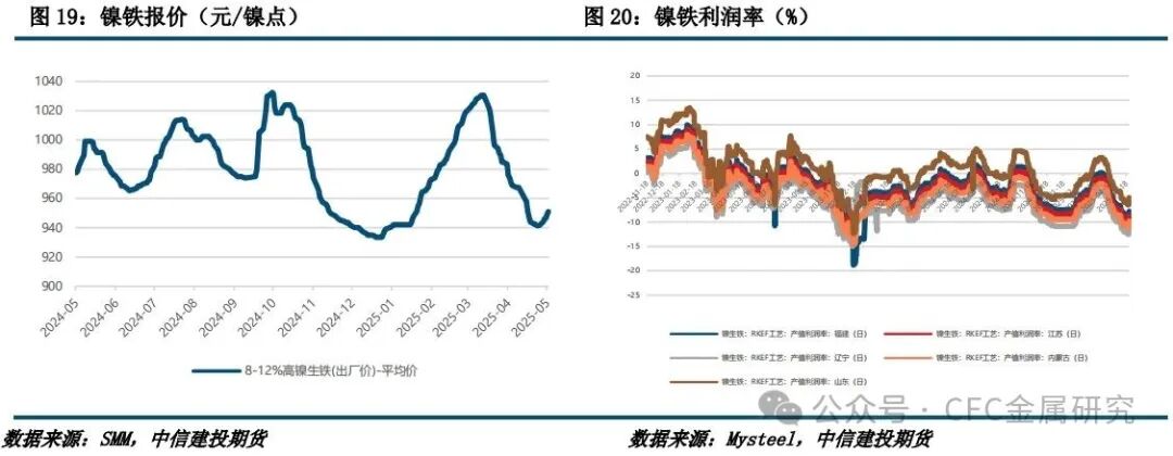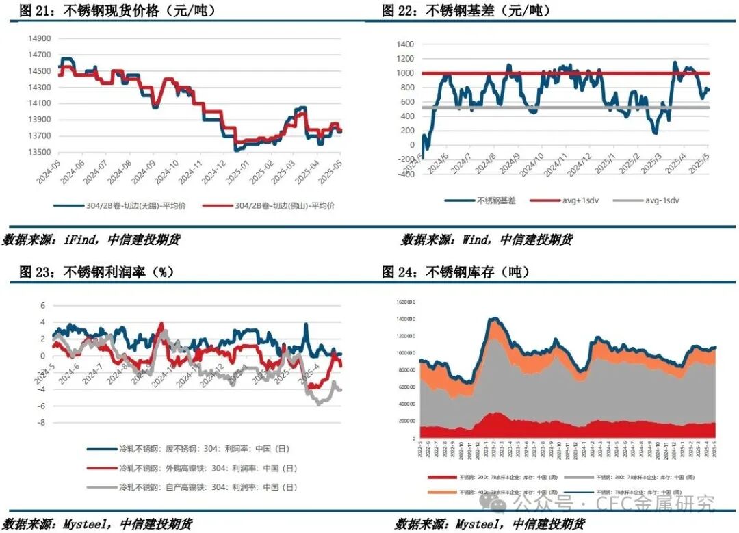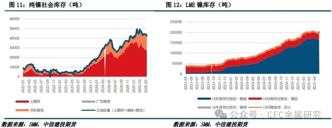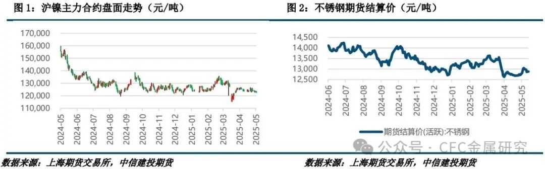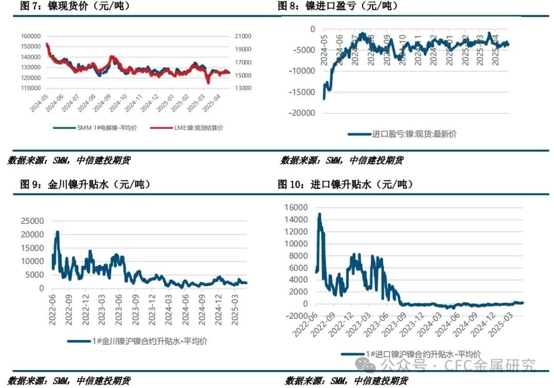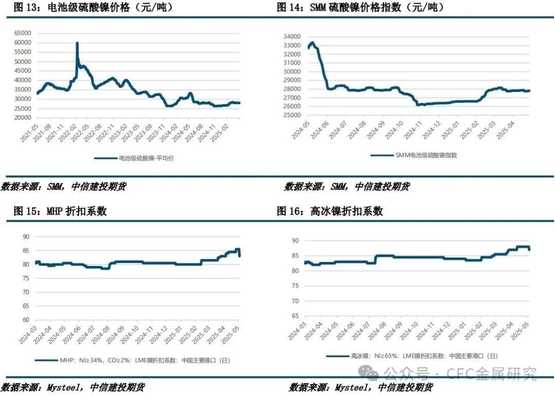行情回顾 本周镍不锈钢震荡偏弱运行。周内沪镍-1.44%,伦镍-1.41%,不锈钢-0.96%。 价格影响因素分析 1、宏观面 1·1、国外 特朗普威胁自6月1日起对欧盟征收50%关税。日本首相石破茂:与特朗普进行了通话,日本将继续寻求取消额外的美国关税。报道:印度和美国可能在未来7-10天内达成原则性贸易协议。美国海关日关税收入增至创纪录的165亿美元。 特朗普:我警告过库克,苹果必须本土制造,不然征税25%!分析师:“荒谬”,苹果扛下关税都比迁回美国强。苹果股价八连跌。特朗普对三星和其他手机制造商发出关税威胁。贝森特:关税威胁是促欧盟提速,未来数周将出现几个大的贸易协议,SLR将修改、有望支撑美债,预计到2028年美国预算赤字占GDP的比重降至“以3%开头”,部分依赖关税收入。 美国5月Markit制造业和服务业PMI均超预期且扩张,价格指数再涨。欧元区5月PMI意外萎缩,服务业创16个月来最差表现。 一票之差,特朗普减税案在众院涉险过关,参院还有难关得过。美联储当红理事沃勒:减税法案引发美债抛售,若关税企稳下半年将降息。美国暂停哈佛大学招收国际学生资格,在校外国学生转学“否则将失去合法身份”。 1·2、国内 中国5年期和1年期LPR利率均下调10基点,为年内首降。5月20日周二,中国人民银行授权全国银行间同业拆借中心公布,中国1年期贷款市场报价利率(LPR)最新报3.00%,上次为3.10%;5年期LPR报3.50%,上次为3.60%。 中国商务部:美方行为严重破坏中美日内瓦高层会谈共识,要求美方纠偏纠错。商务部表示,中方注意到,近日美方对AI芯片出口管制指南新闻稿相关表述进行了调整,但指南本身的歧视性措施和扭曲市场本质并没有改变。中方敦促美方立即纠正错误做法,停止对华歧视性措施。若美方一意孤行,继续实质性损害中方利益,中方必将采取坚决措施,维护自身正当权益。 4月社会消费品零售总额同比放缓至5.1%,家电家具、文化用品等以旧换新相关商品增长较快。消费品以旧换新政策持续显效,限额以上单位家用电器和音像器材类、文化办公用品类、家具类、通讯器材类商品零售额分别增长38.8%、33.5%、26.9%、19.9%。金银珠宝类零售总额同比增长25.%,汽车类消费增长0.7%,石油及制品类零售额下降5.7%。 4月规模以上工业增加值同比增长6.1%,工业机器人、新能源汽车产量加速增长。41个大类行业中有36个行业增加值保持同比增长,铁路、船舶、航空航天和其他运输设备制造业、电气机械和器材制造业等增速较快。工业机器人、新能源汽车产品产量同比分别增长51.5%和38.9%。 2、基本面 本周纯镍价格下跌。近期镍的基本面无明显变化,市场成交一般,过剩延续的情况下市场情绪延续悲观,印尼中间品资源偏紧导致镍的成本支撑较强,但又缺乏进一步利多,预计继续震荡运行。总的来说,目前镍市基本面矛盾有限,短期或维持震荡。 本周硫酸镍价格小幅上涨。印尼MHP仍维持偏紧状态,Mysteel数据显示目前MHP折扣系数在85-86,高冰镍在88,受此影响硫酸镍成本支撑较强,但需求侧仍然疲软,现货市场成交维持清淡。总的来说,硫酸镍成本支撑较强,但下游需求未见好转,后市价格或震荡运行。 本周镍矿CIF价格持平。菲律宾方面,受降雨影响,镍矿发运相对受阻,但下游需求同样冷清,导致镍矿价格相对僵持;印尼方面,镍矿偏紧的状态延续,内贸升水继续维持在26-27美元/湿吨。总的来说,镍矿供应偏紧但需求乏力,矿端支撑或将持续。 本周镍铁价格上涨。本周镍铁成交单数较多,成本端镍矿价格高位坚挺,供应端镍铁减产意愿走强,导致成交价格有回暖趋势。总的来说,镍铁环节减产意愿走强,过剩收窄导致价格暂时企稳。 本周不锈钢现货价格持平。目前市场成交延续清淡,下游采购压价情绪较重,但受制于成本支撑,实际议价空间也相对有限。总的来说,不锈钢需求表现较弱,后市价格或震荡偏弱运行。 策略 宏观方面,海外关税扰动再起,但对国内直接冲击或有限,国内宏观情绪降温,总体来看镍不锈钢宏观驱动有限。 纯镍:目前镍市基本面矛盾有限,短期或维持震荡。 硫酸镍:硫酸镍成本支撑较强,但下游需求未见好转,后市价格或震荡运行。 镍矿:镍矿供应偏紧但需求乏力,矿端支撑或将持续。 镍铁:镍铁环节减产意愿走强,过剩收窄导致价格暂时企稳。 不锈钢:不锈钢需求表现较弱,后市价格或震荡偏弱运行。 沪镍2507参考区间118000-126000元/吨。SS2507参考区间12500-13200元/吨。 操作上,镍不锈钢区间操作。